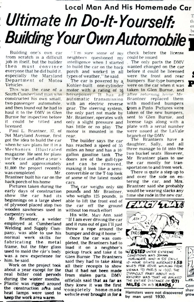 Once the car was completed, the Brantners had to load it on a neighbor’s pickup truck and take it to Glen Burnie. The Brantners said they had to take along all their receipts to show that it had not been made from stolen parts. DMV officials said that as far as they knew it was the first completely home-made vehicle ever brought in for a check before the license could be issued.