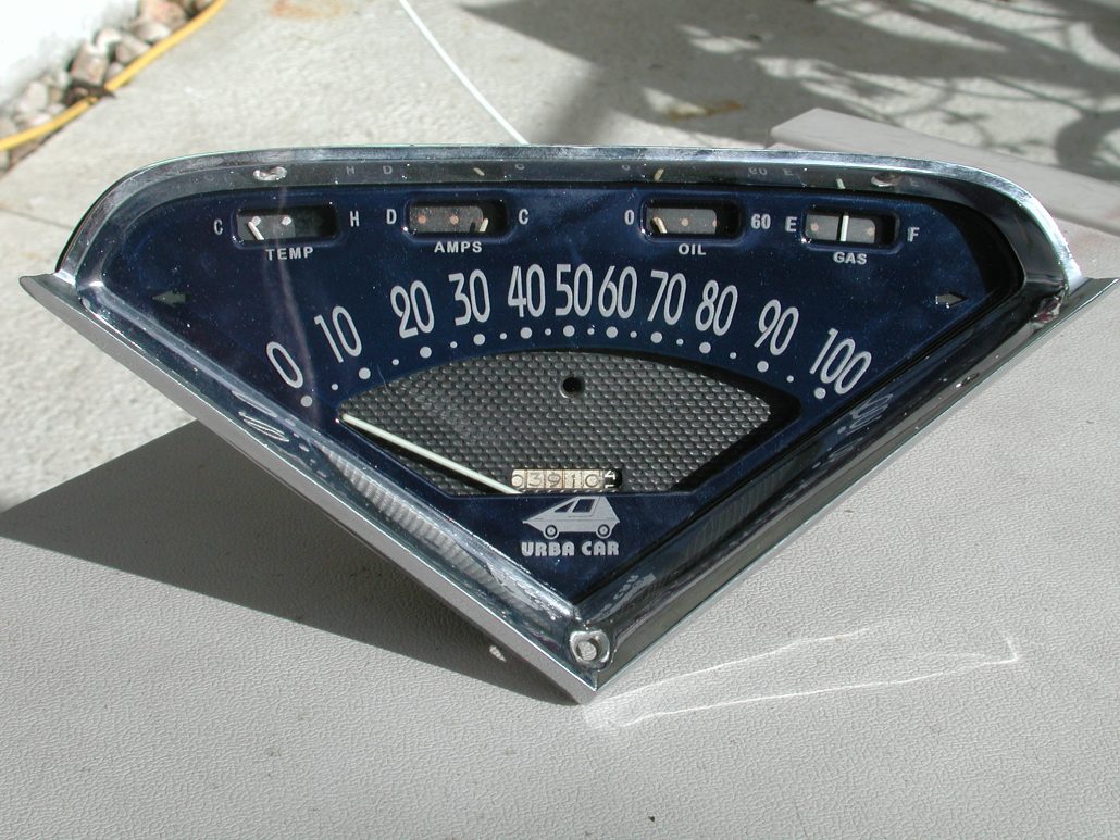 * Dashboard – We’ve customized a 1957 Chevrolet Truck instrument cluster that is shaped like a “wedge” with a more modern font style, and the Urba Car logo at the bottom center. It’s been color-coded to complement the planned blue color of the finished car.
