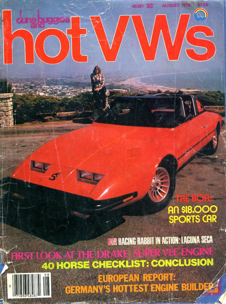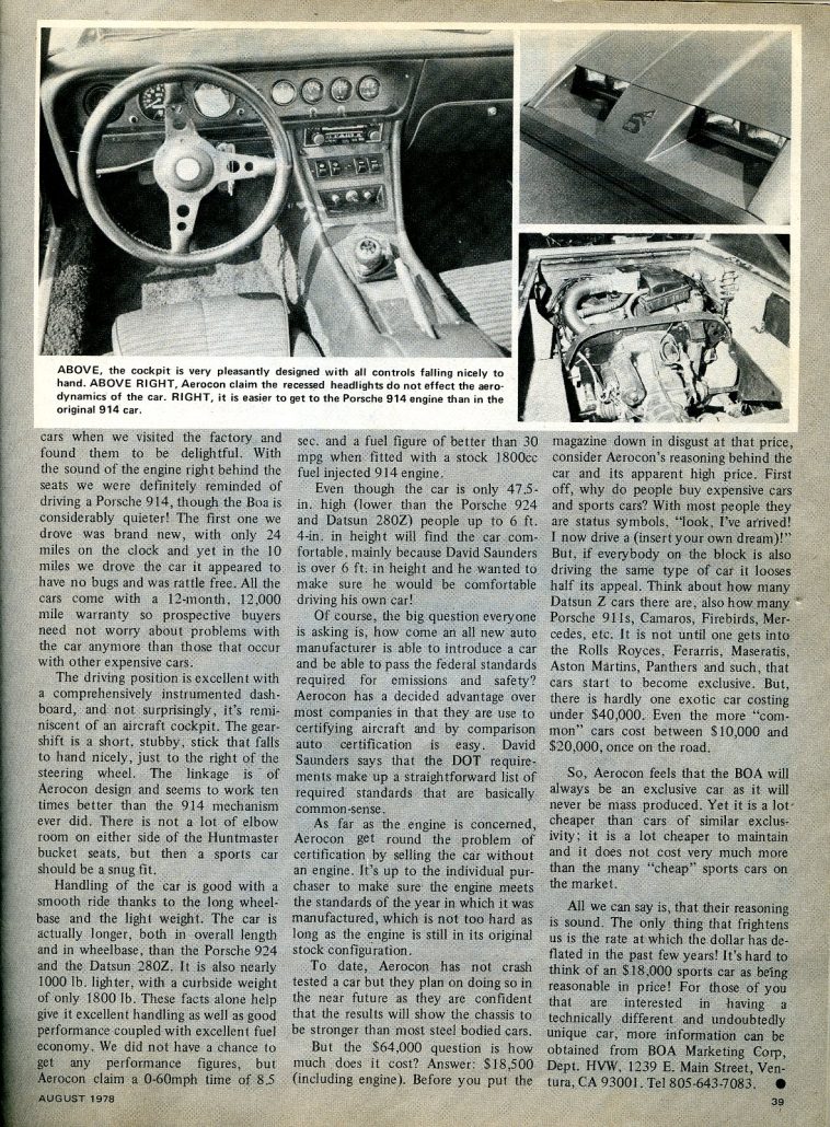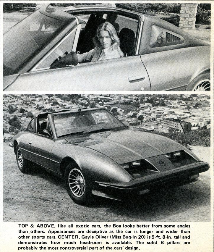 For those of you that are interested in having a technically different and undoubtedly unique car, more information can be obtained from BOA Marketing Corp., Dept. HVW, 139 E Main Street, Ventura, CA 93001. Tel 805-643-7083.