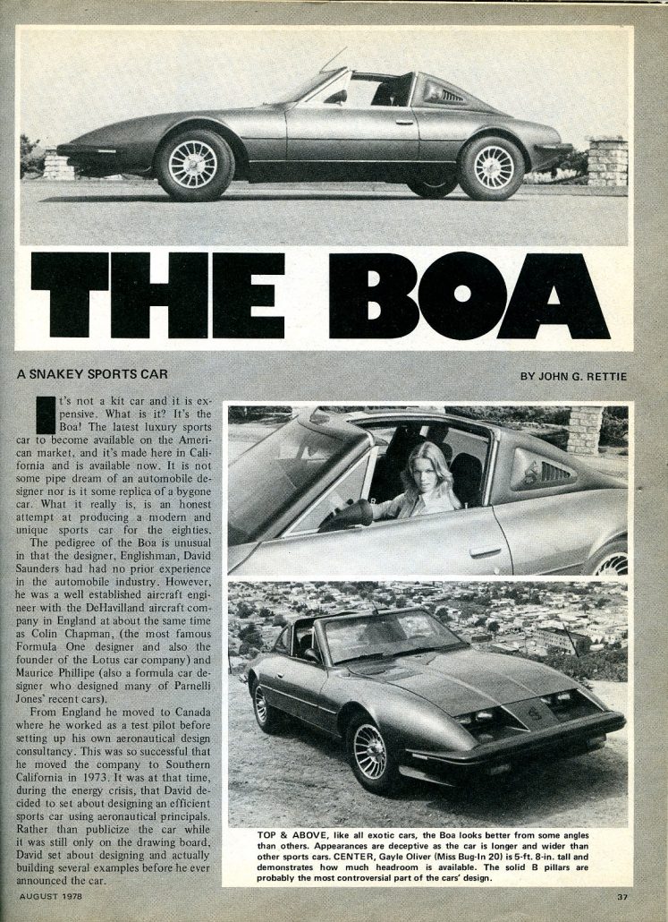 The pedigree of the Boa is unusual in that the designer, Englishman, David Saunders had had no prior experience in the automobile industry. However, he was a well established aircraft engineer with the DeHavilland aircraft company in England at about the same time as Colin Chapman, (the most famous Formula One designer and also the founder of the Lotus car company) and Maurice Phillipe (also a formula car designer who designed many of Parnelli Jones’ recent cars).