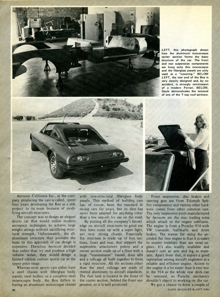 As an owner of an Aerocon Boa I could be accused of bias. Let me say a few words about these cars. These are factory built cars. There were only 15 completed. They are built to aircraft standards by an aircraft engineer. From a design perspective some angles are a not ideal. However, the overall package for a rare late 1970’s car scores high. Here’s a link to a little more information.