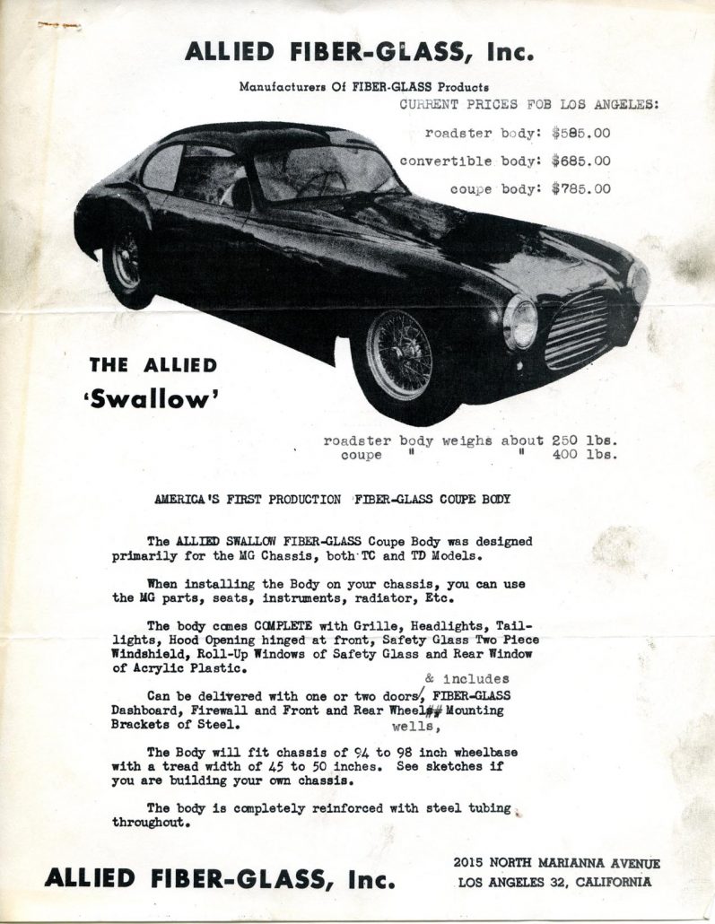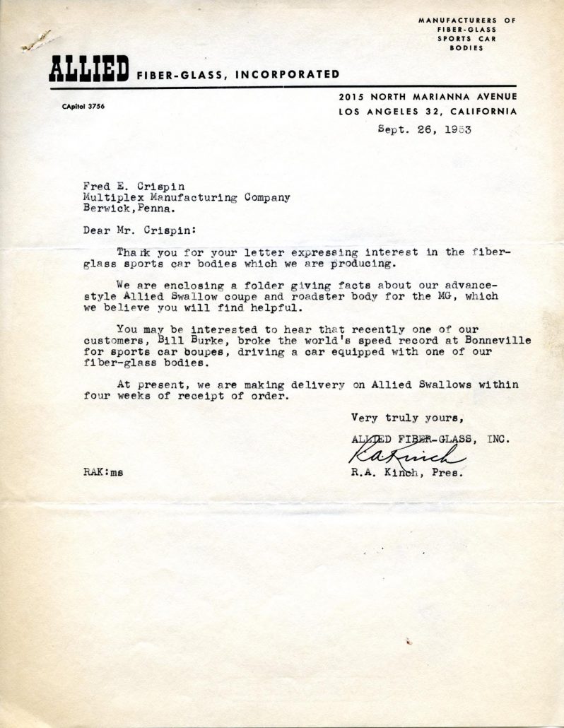 Thanks again to the Crispin and Kunicki families as well as Alden Jewell for helping make this story possible. And…we’ll be on a roll for a few more stories about Allied Fiberglass and the brochures and sales papers utilized to market their cars and company in the near future.