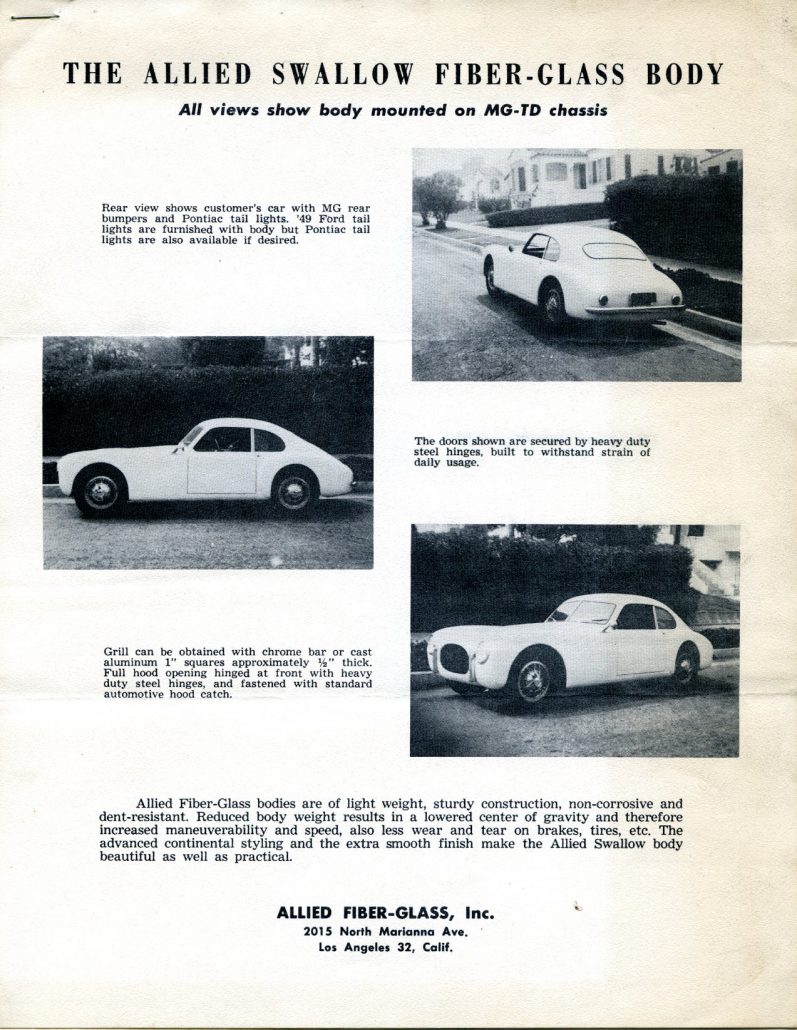 The guys at Allied Fiber-Glass Company were not slackers.  They produced more versions of their brochures from late ’53 thru early ’55 than any other fiberglass car company I’ve found.  Today’s story shows a new version of their main promotional piece for their 94″ sports car body called the “Allied Swallow.”