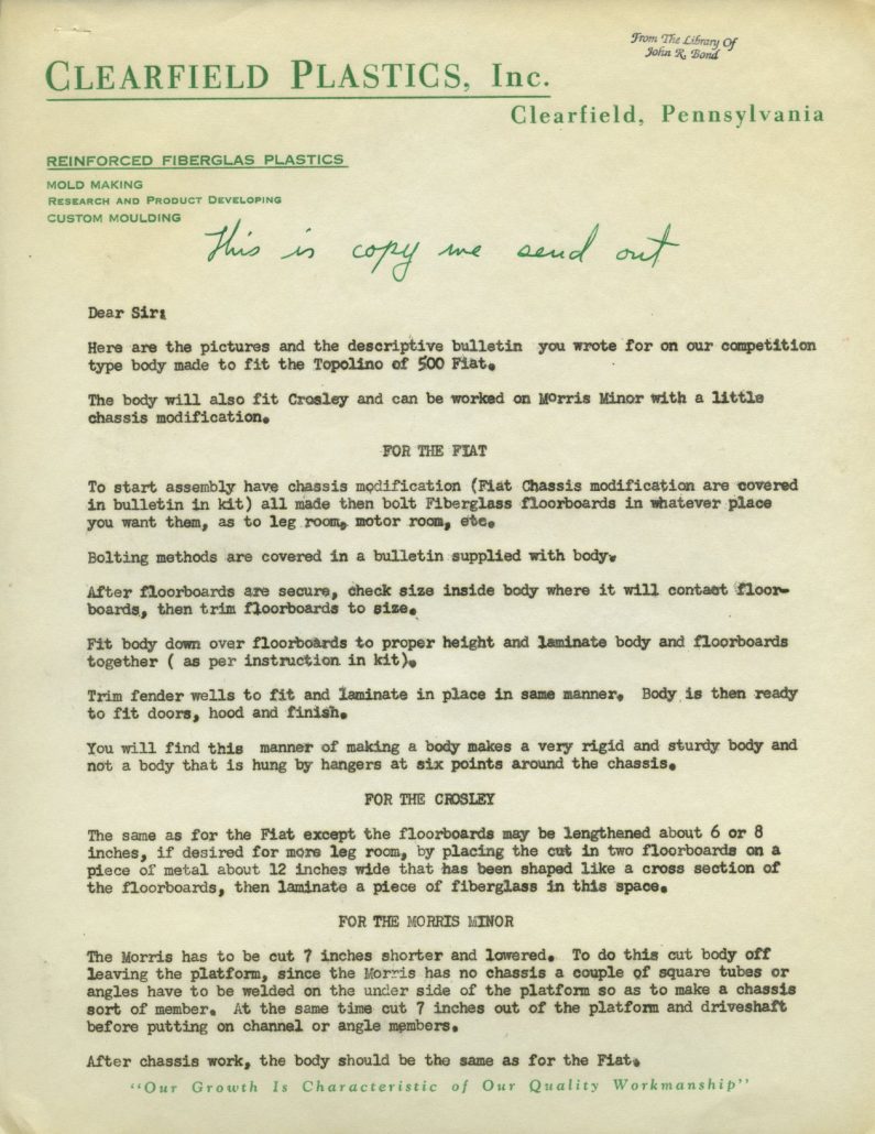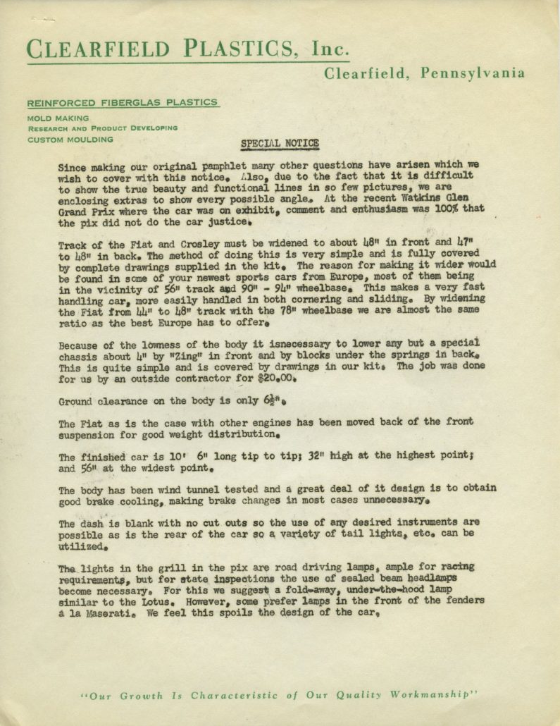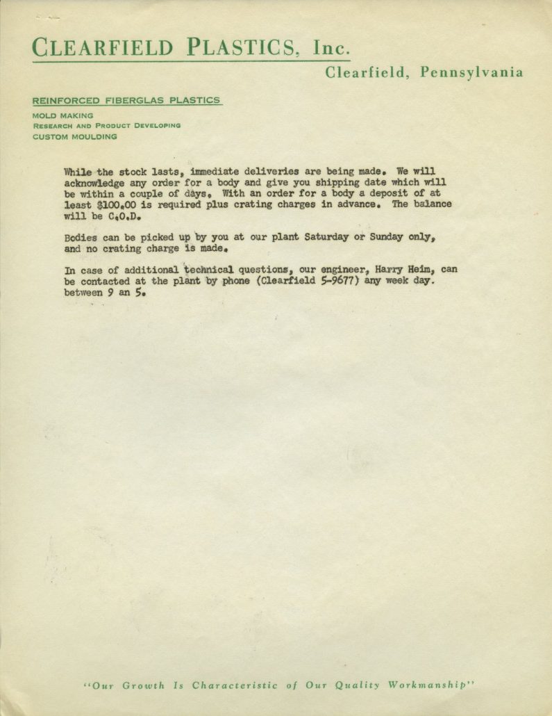 Back in the ‘50s, any fiberglass company would be thrilled to get a letter from Road & Track Magazine inquiring about the company and specifics on what is available for customers to purchase. I’m sure that’s how Harry Heim felt. He was Vice President and Production Manager / Engineer for Clearfield Plastics, Inc., of Clearfield Pennsylvania, and responded to their inquiry in a letter to Road & Track in October, ’55.