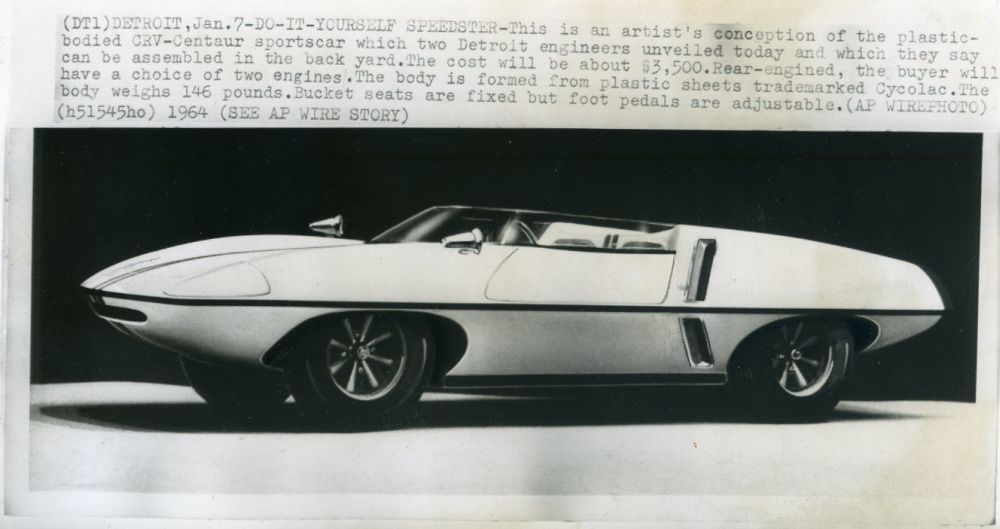 Detroit, January 7, 1965 (AP) – This is an artist’s conception of the plastic-bodied CRV-Centaur sportscar which two Detroit engineers unveiled today and which they say can be assembled in the backyard. The cost will be about $3,500. Rear-engined, the buyer will have a choice of two engines. The body is formed from plastic sheets trademarked Cycolac. The body weighs 146 pounds. Bucket seats are fixed but foot pedals are adjustable.