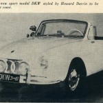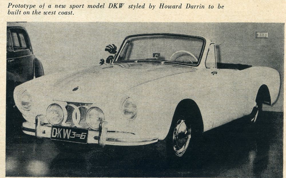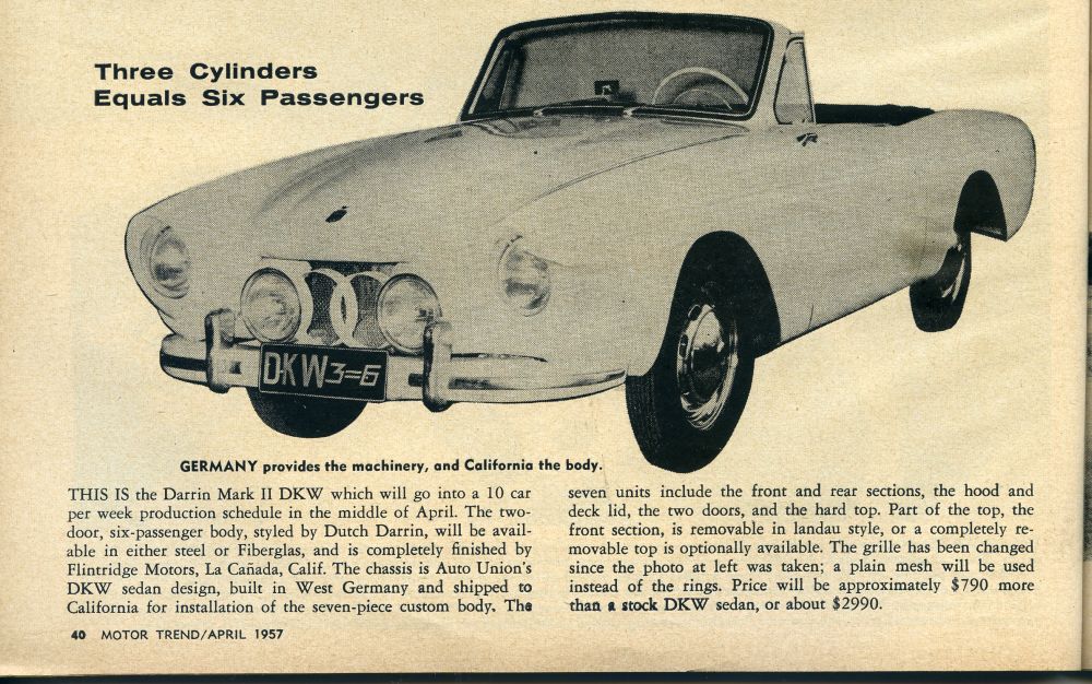 So far we’ve found two magazines that heralded the announcement that a newly designed “Dutch Darrin” DKW car that would ultimately be sold by Flintridge Motors of Los Angeles, California. Each occurred early in ’57 and the plans were changing – even between the publication of both magazines. Let’s have a look and see what each has to say: