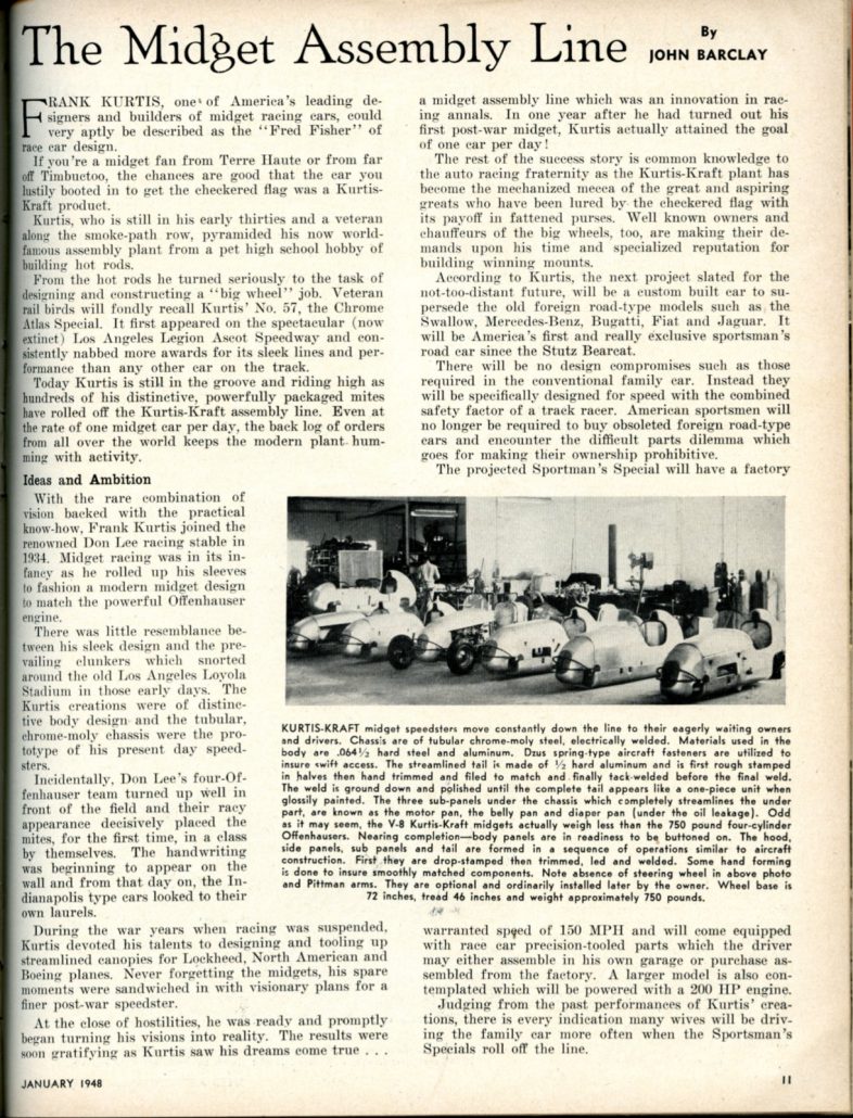 The most interesting piece I’ve found so far on the Kurtis Sports Car actually appeared in the January 1948 issue of Speed Age – nearly 1 year before the current article shown later in this story. This article actually talked about the Kurtis “Midget Assembly Line,” but embedded in the article is the earliest known reference to the Kurtis Sports Car – but by a different name – the “Sportsman Special.”