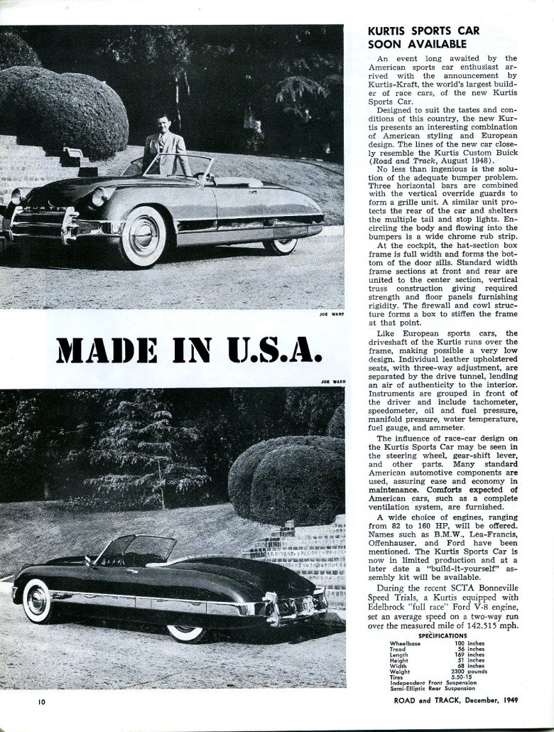 It wasn’t until nearly a full year later that the Kurtis Sports Car came into being and a prototype was ready for display. This happened in the late Summer / early Fall of 1949. Let’s see what Road and Track had to say about the debut of the Kurtis Sports Car in December, 1949: