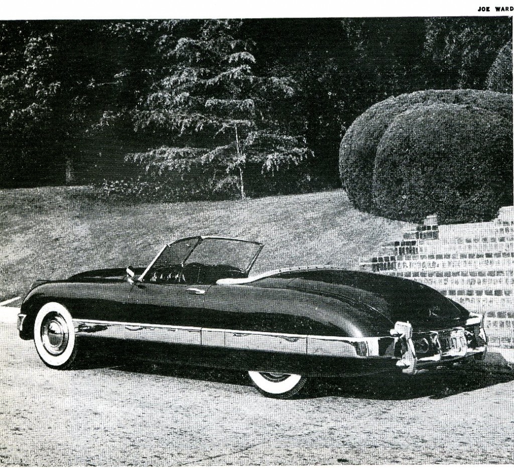 The lines of the new car closely resemble the Kurtis Custom Buick (Road and Track, August 1948). No less than ingenious is the solution of the adequate bumper problem. Three horizontal bars are combined with the vertical override guards to form a grille unit.
