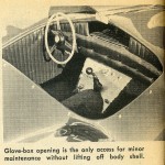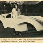 Power will be supplied by a Renault Dauphine engine mounted in the rear and the suspension components are from the same Dauphine. The type of construction should provide the answer for those who live where salt is used on the roads in the winter for, with a wood fiberglass chassis and a fiberglass body, there is little steel to rust out.