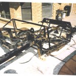 When I got to El Paso I couldn’t believe my eyes. There, hanging in a garage was a weatherbeaten, but new Victress S1-A body shell. It was never painted, still was natural fiberglass color, still had mold release on it from some fifty years earlier and still had the factory jig clips molded in all four corners. And over in a corner was a factory Mameco frame with a crude cowl hoop, rear bulkhead and a mess of angle iron welded to it, obviously someone’s attempt to fit out the frame for the Victress. It also had a dual exhaust underneath suggesting it may have been engined at one time. The body’s hood had a round cutout for an air cleaner so I suspect the body had at least sat on that frame over an engine at some point, but the car was never finished.