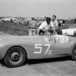 A real innovation was an airfoil mounted under the rear end behind the rear wheels. It was pivoted in back, sprung with surplus parachute shock cord and connected to a lever in the driver’s compartment. Its purpose was to slow the car and create downforce. He’d blast down the straights and when a turn came up, snap the airfoil down which he figured at 100 MPH created 300 Lbs. downforce. After the turn was negotiated, the airfoil was pulled up until the next turn. A picture of the car at Laguna Seca with my brother Tim looking on is attached. Note the airfoil. He was fond of calling it his, “reverse manure spreader.”