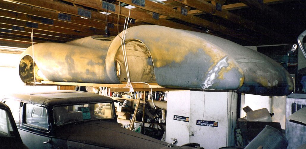 The next was a 36 Ford-based sports car. He used the Ford running gear, put in a 24 stud flathead, made up a plaster mold, popped a fiberglass shell off it and voila, a little car that flat out would do 100 miles an hour. He made the body in one piece, all the edges going straight down so it would release from the mold. It looked like….”an old woman bent over,” he’d smile and say. He gave it to our friend Mike Studzinski.