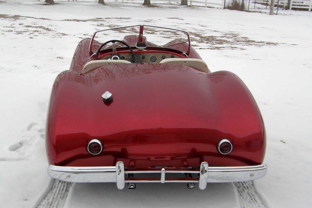 “Bill Tritt reported that this car was made in 1953 by the factory. Approximately 10 automobiles were completed by the factory, and one of those, car number 38, was fitted with a Cadillac engine and transmission. The differential and suspension were Ford. While the most popular engine put in the Glasspar G2 was a Ford flathead, car owners had Cadillac, Buick, Chrysler, and Lincoln engines also installed.”