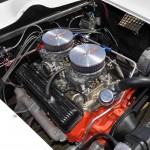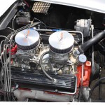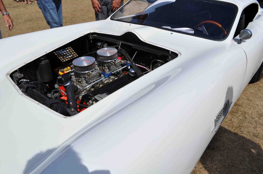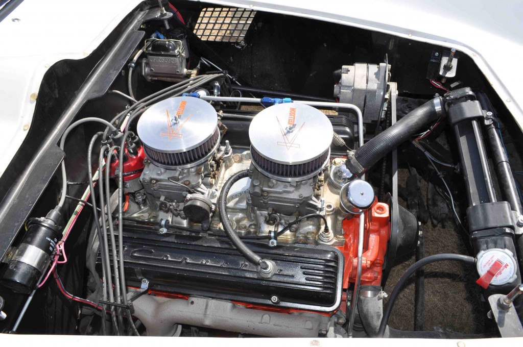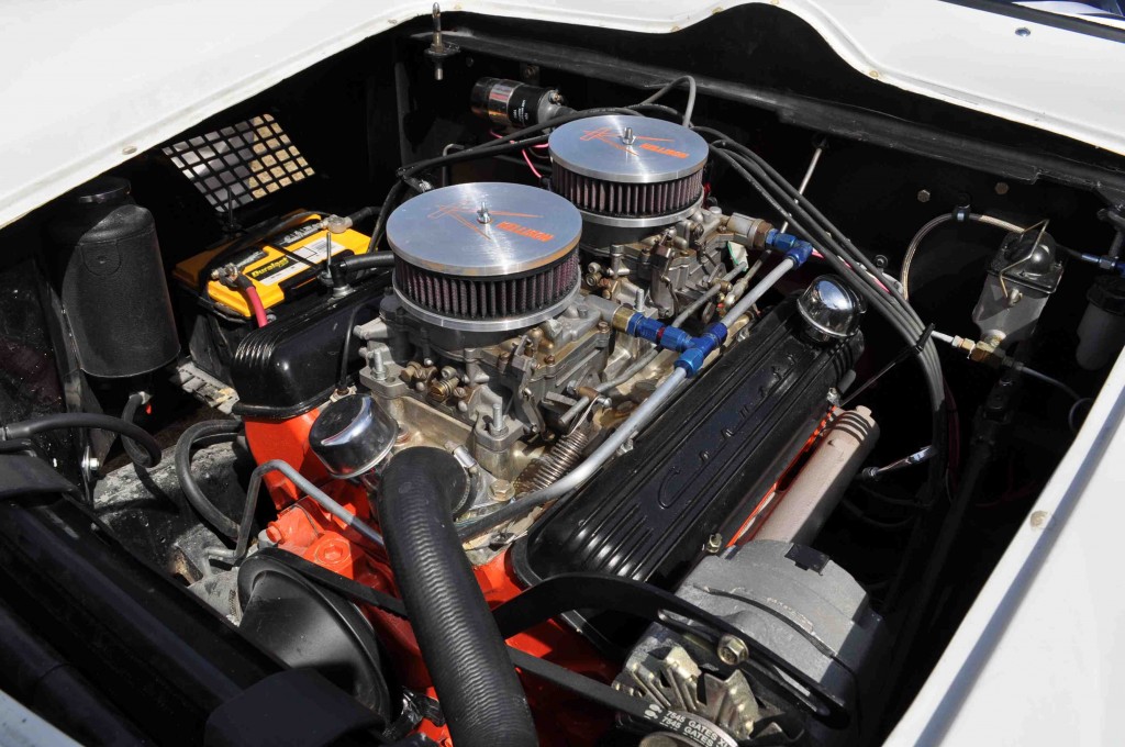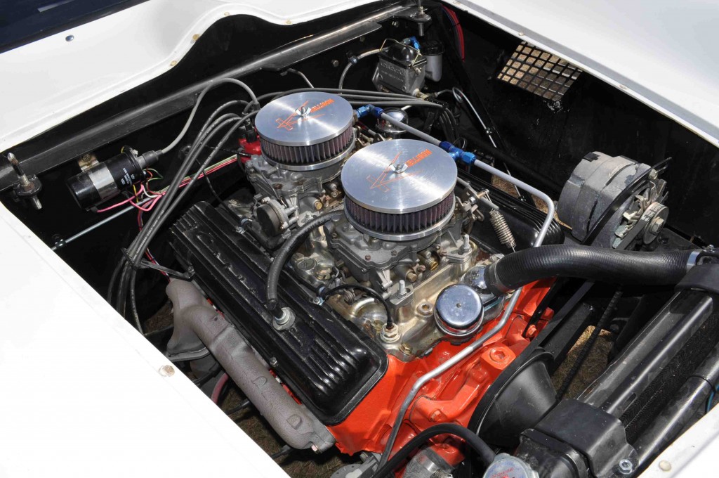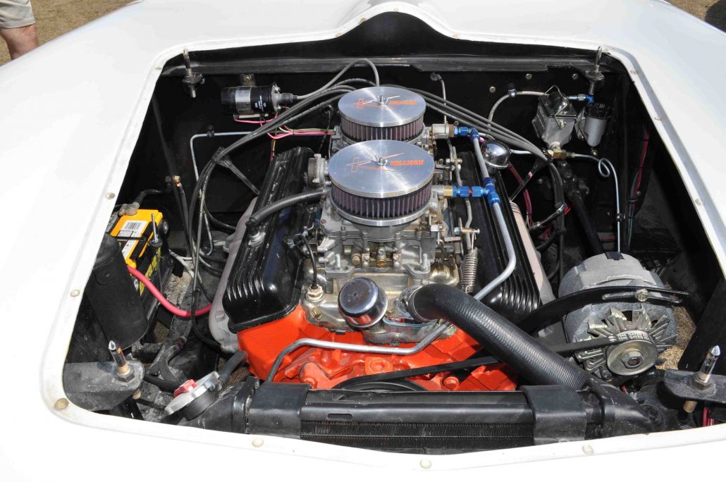 This has a 283 Chevrolet V8 with period Carter dual quads on an Offenhauser intake. The Milwaukee program above incorrectly states the car weighs 3200 lbs, That should read 2300 lbs.