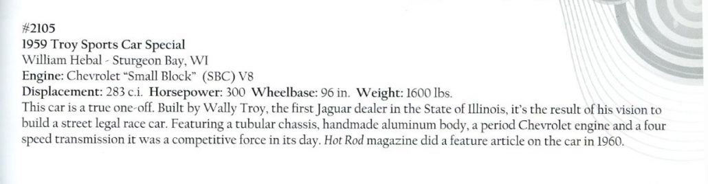 Today’s story shows the “Troy Sports Special” with the “Bosley.” This is an important pair of cars to show especially for one person – Bill Hebal. Bill is the current owner of the Troy Sports Special, and was the person who rescued the car in the 1970’s and began its restoration path which ultimately took it to Pebble Beach with future owners Ron and Sonya Kellogg, of Whittier California.