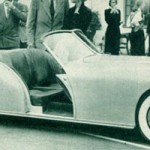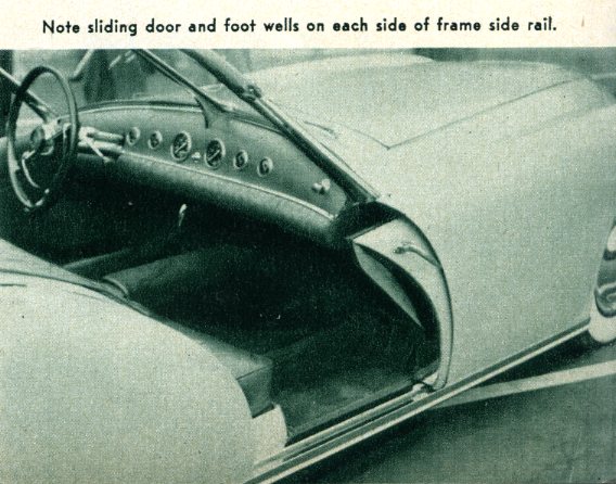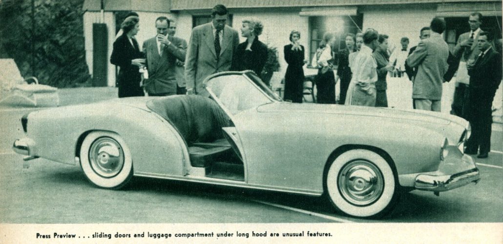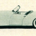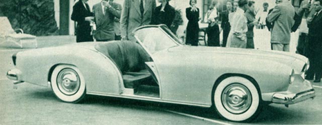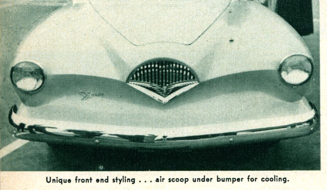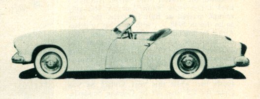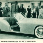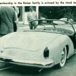 Howard Darrin’s latest effort is the new sports car prototype body, mounted on the stock Henry J chassis. Mr. Darrin saw the possibilities of fiberglass construction very early and his custom convertible built in 1945 utilized that material for body paneling.