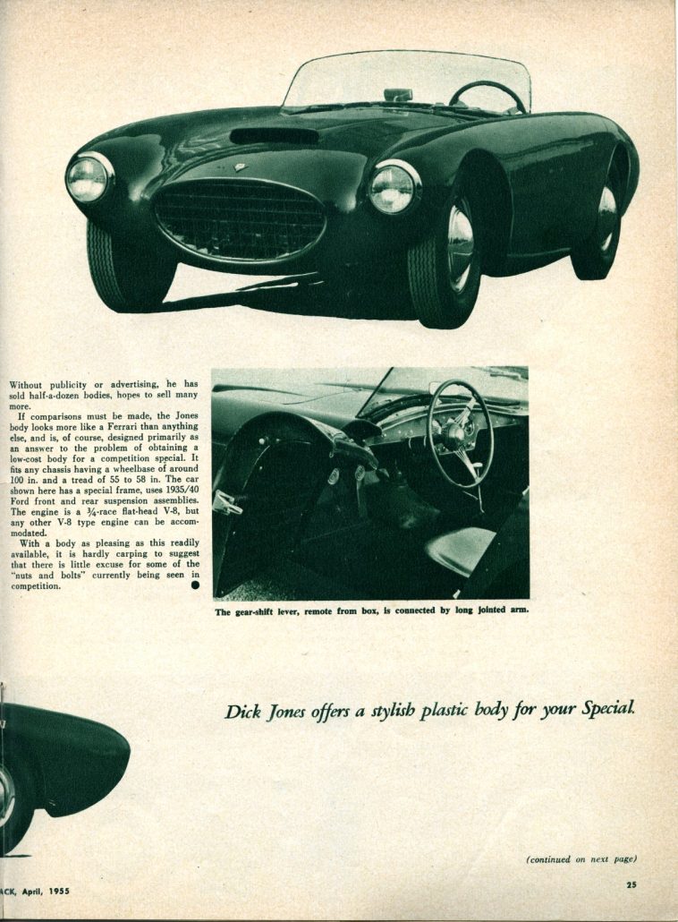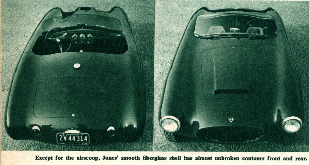 If comparisons must be made, the Jones body looks more like a Ferrari than anything else, and is, of course, designed primarily as an answer to the problem of obtaining a low-cost body for a competition special. It fits any chassis having a wheelbase of around 100 inches and a tread of 55 to 58 inches.