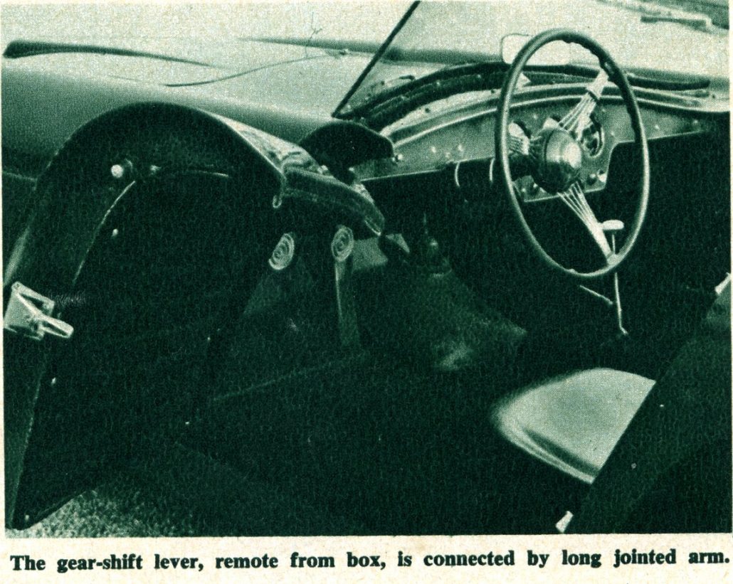 - Caption: The gear-shift lever, remote from box, is connected by long jointed arm.
