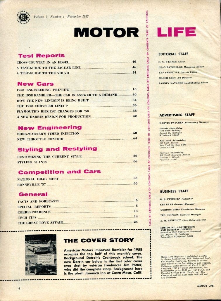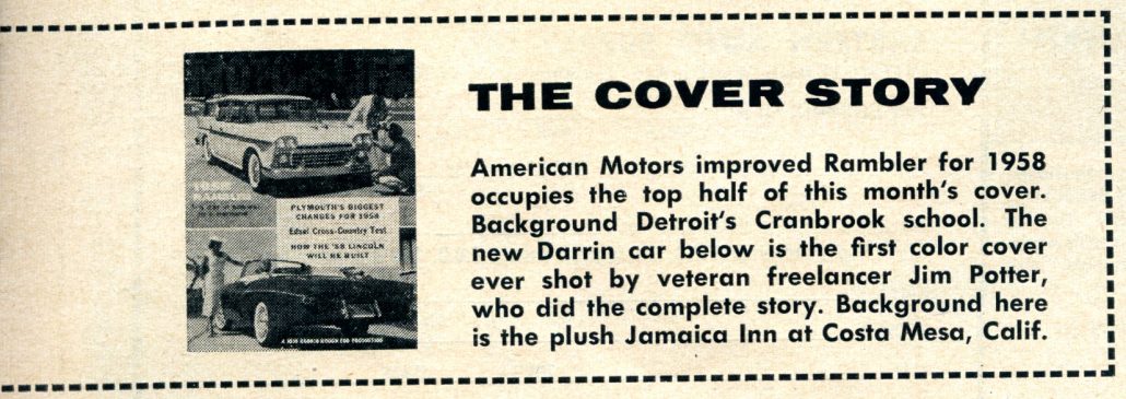 Inside Cover Note: The new Darrin car (on cover) is the first color cover ever shot by veteran freelancer Jim Potter, who did the complete story. Background (of picture) here is the plush Jamaica Inn at Costa Mesa, California.