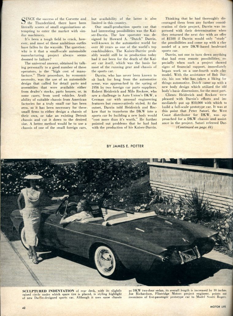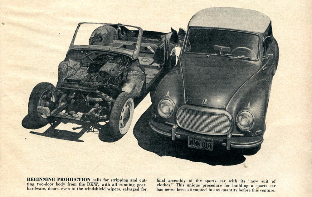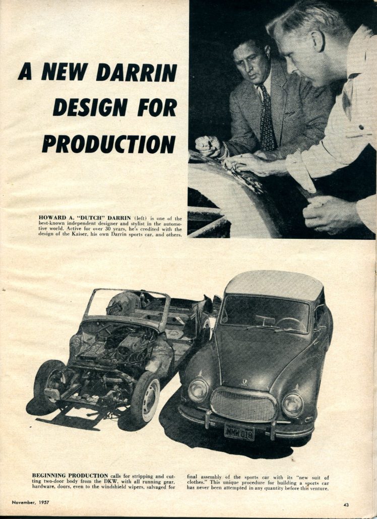 Darrin, who has never been known to sit back for long from the automotive scene, was approached in the spring of 1956 by two foreign car parts suppliers, Robert Heidreich and Milo Reckow, who saw a challenge in Auto Union’s DKW, a German car with unusual engineering features but conservatively styled.
