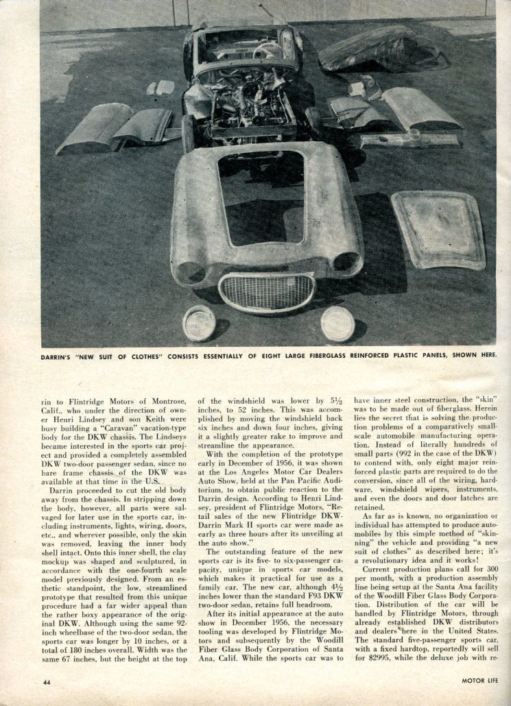 Satori referred Darrin to Flintridge Motors of Montrose, Calif., who under the direction of owner Henri Lindsey and son Keith were busy building a “Caravan” vacation-type body for the DKW chassis. The Lindseys became interested in the sports car project and provided a completely assembled DKW two-door passenger sedan, since no bare frame chassis of the DKW was available at that time in the U.S.