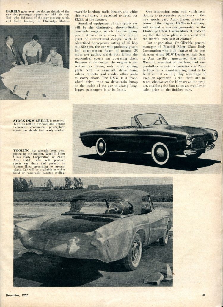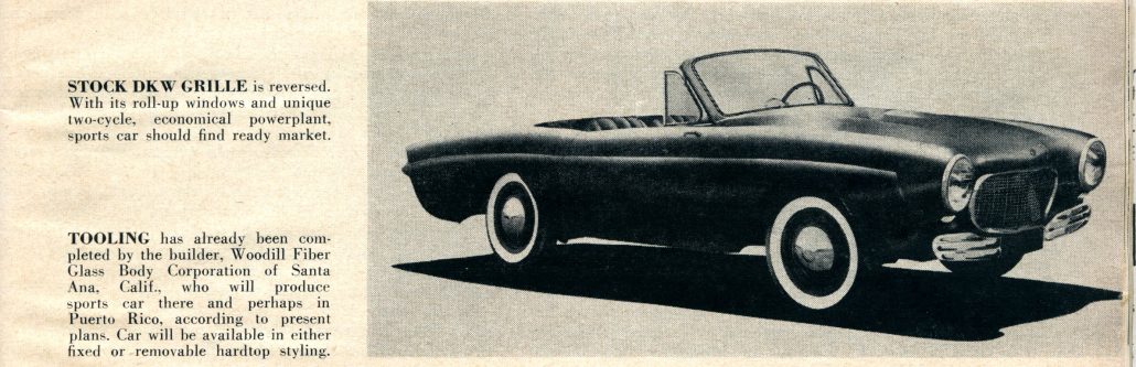 Just at press time, Cy Olbrich, general manager of Woodill Fiber Glass Body Corporation who is in charge of the production of the DKW-Darrin at their Santa Ana facility, announced that B. R.Woodill, president of the firm, had successfully completed negotiations in Puerto Rico for a manufacturing plant to be built in that country.