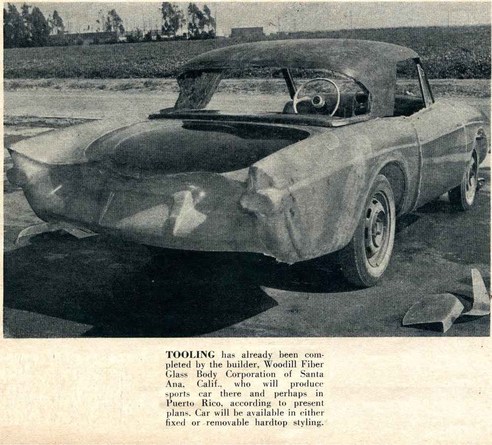 After its initial appearance at the auto show in December 1956, the necessary tooling was developed by Flintridge Motors and subsequently by the Woodill Fiber Glass Body Corporation of Santa Ana, Calif. While the sports car was to have inner steel construction, the “skin” was to be made out of fiberglass.