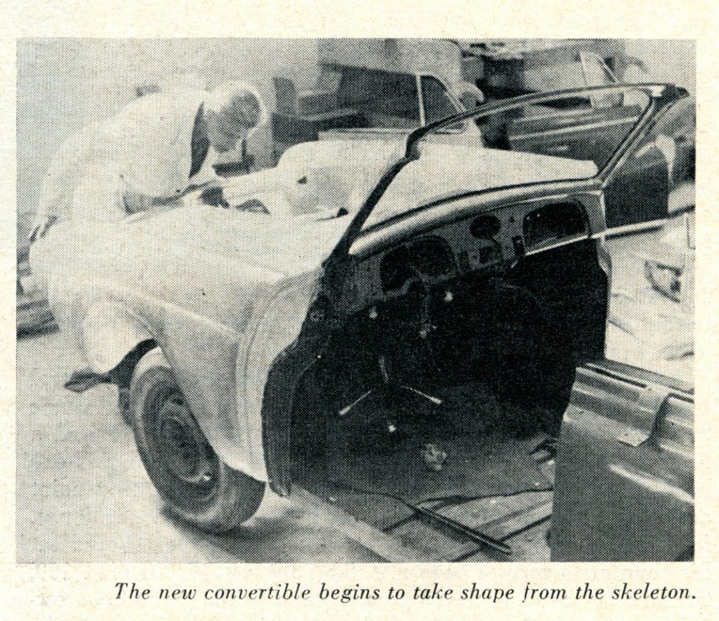 Actual manufacturing is handled by the Woodill Fiber Glass Body Corporation of Santa Ana, California. DKW coupes are delivered directly from the Port of Entry at San Pedro to the Woodill factory. There, all interior upholstery is removed, and the top, doors, fenders, and instruments taken from the car.
