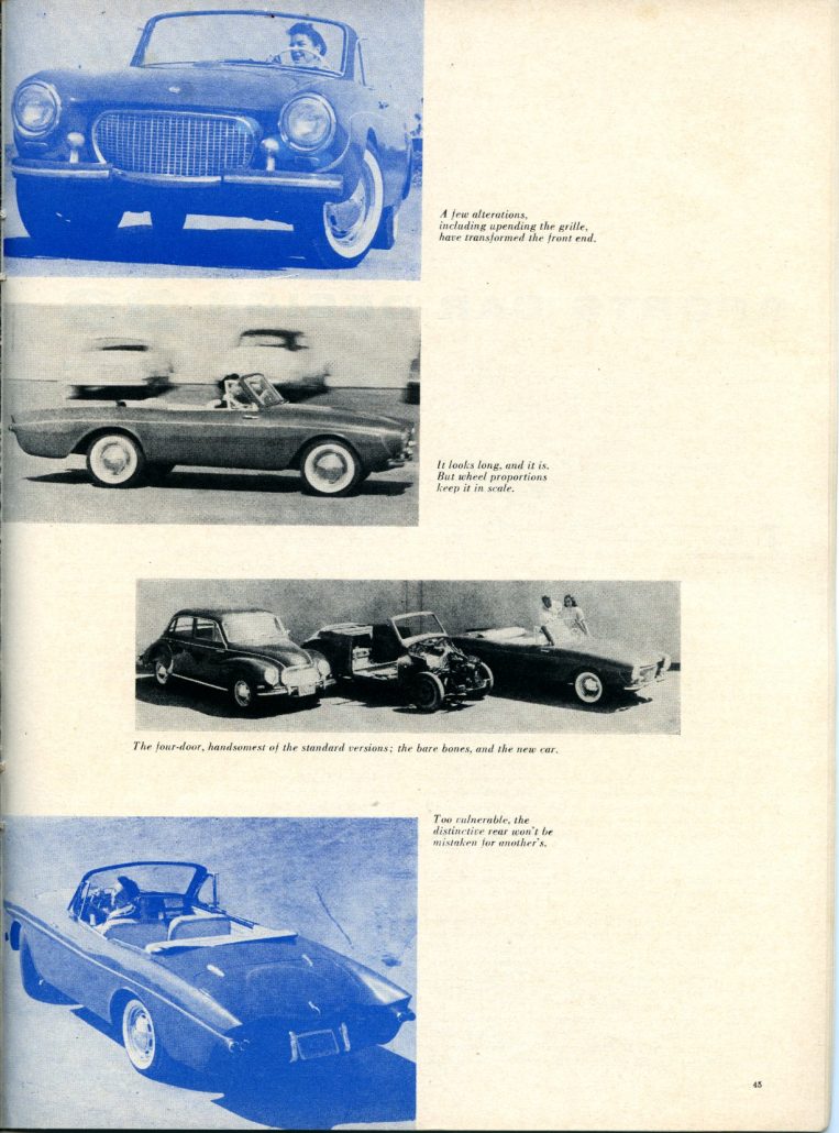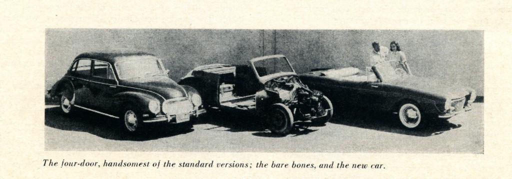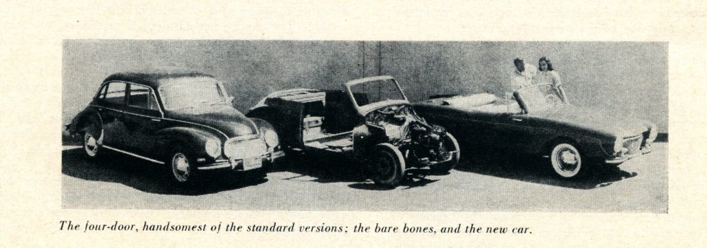 We also talked with the Citroen dealer in Beverly Hills about the 2CV, a strange little car with a neat suspension system designed for bad French roads. Nothing came of either discussion, probably because we were too small, under-financed, and not well-known. It’s possible that we put the bug in Flintridge Motors’ ear about doing fiberglass-bodied DKW. Who knows?