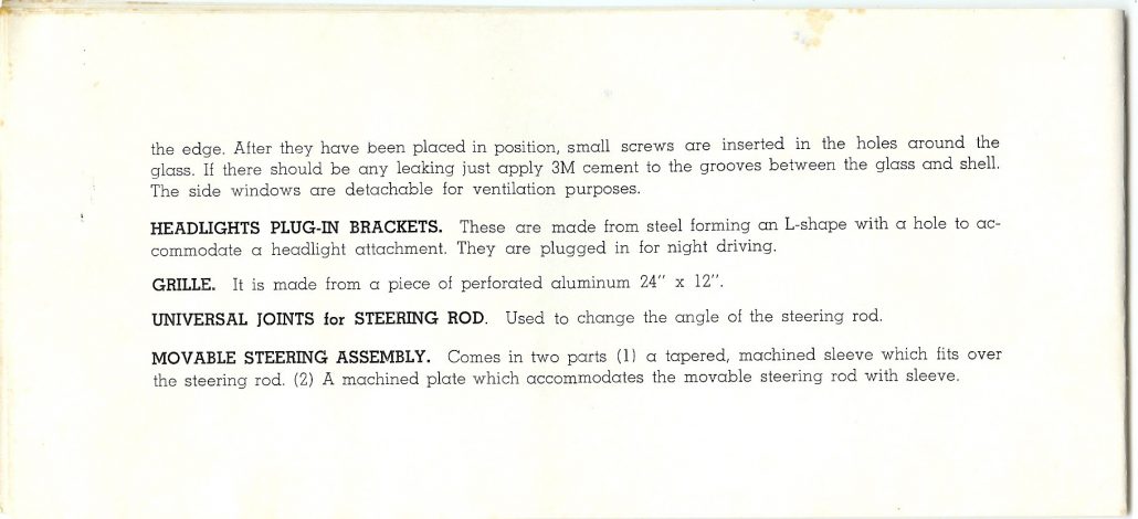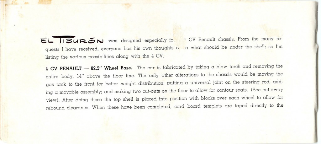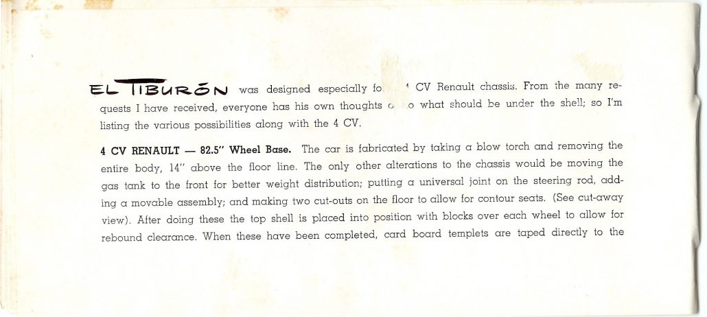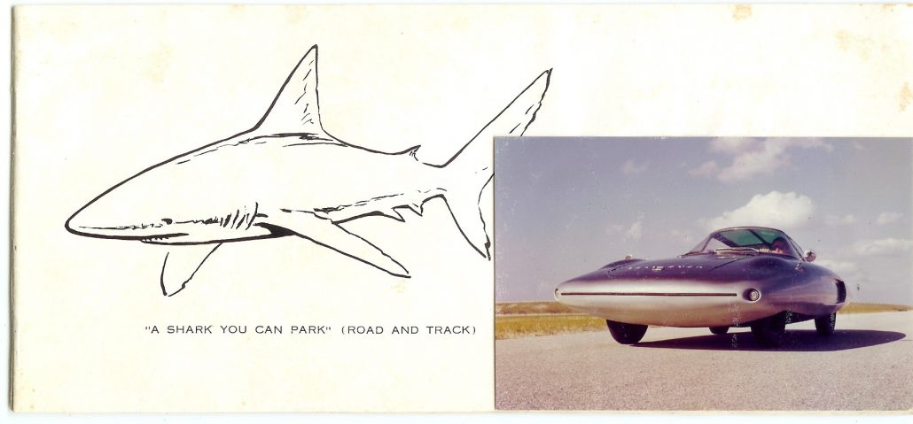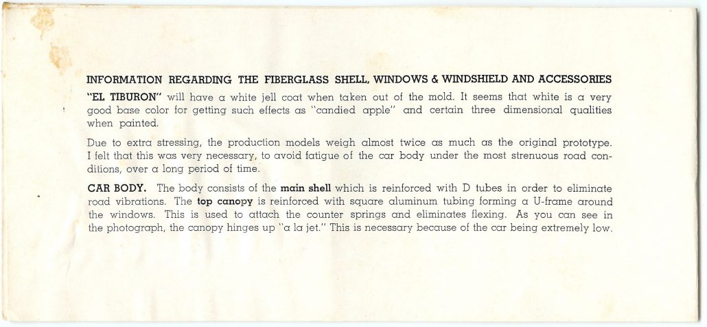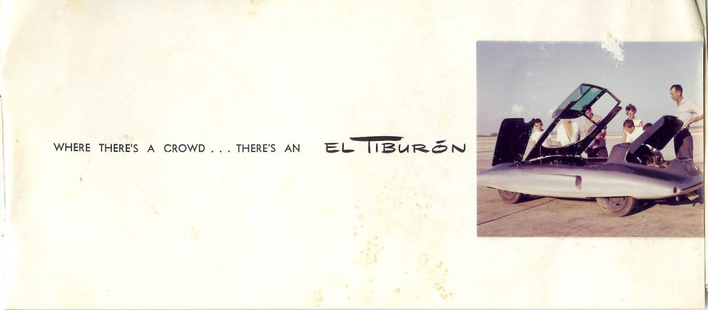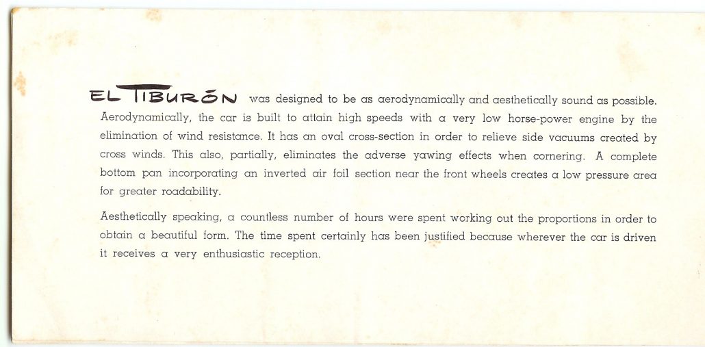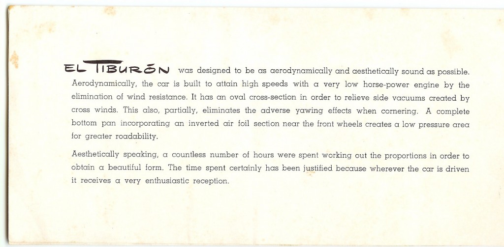 It is 16 pages, with three color photographs and three pen & ink sketches done by my dad (Henry Covington, the Designer of the el Tiburon). The front cover has the logo that Dad designed for this car. He styled it with a paintbrush on a poster board after Mom told him “El Tiburon” was Spanish for “The Shark”.