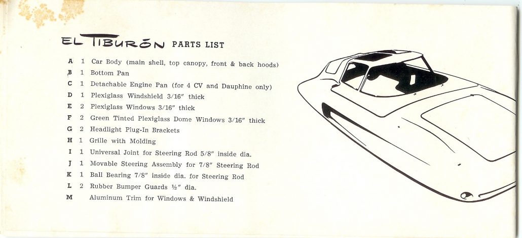 Page 2 has Dad’s pen & ink sketch of a shark in the same pose as the El Tiburon in the photograph. Pages 7 and 8 have sketches of the body and other components of the car that were listed on the price list that you have. Page 10 has a cutaway view showing the profile of the El Tiburon next to a photograph of the same profile.