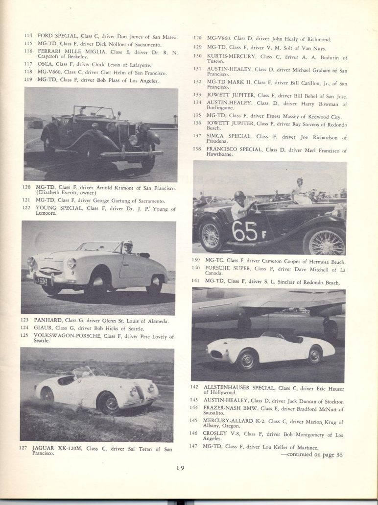 Entrants you don’t see here are John von Neumann in the Ferrari and Richie Ginther and Ken Miles in Porsche Spyders. They were coming off of the previous race and came in the back door to start the race. They turn up in the film of the race start”