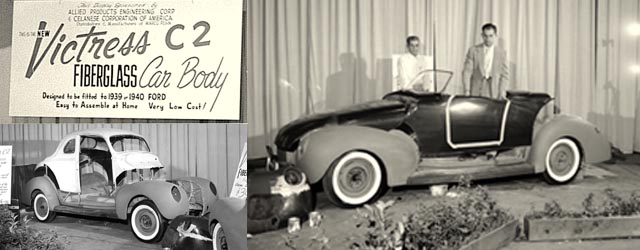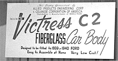 Here’s what’s shown on the Victress Sign: This Display Sponsored By Allied Products Engineering Corporation and Celanese Corporation of America. Distributors of Marco Resin. This is the NEW Victress C2 Fiberglass Car Body. Designed to be fitted to 1939 or 1940 Ford Easy to Assemble at Home. Very Low Cost!