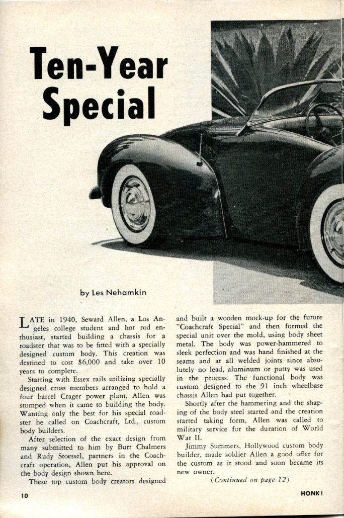 Back around 1951, a custom built (also called “coachbuilt) sports car was being finished after about 10 years of on again /off again work. It was called the “Coachcraft Special” (currently it goes under the name Yankee Doodle – a much less appealing name to me than it’s actual heritage). The “Coachcraft Special” was started by Seward Allen in late 1940, worked on by the builders at Coachcraft in Los Angeles, purchased by Jimmy Summers Hollywood Custom car builder and customizer, and later acquired by Ted Johnson, a garage owner, machinist, and hot rod enthusiast in still incomplete condition. Ted Johnson lived and worked in North Hollywood – very close to Victress Manufactering.