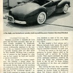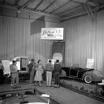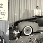 The three pictures provided by Leslie show the steps in making the car – and a close to finished product. I’m ready to make that car now, and several of our “fiberglass friends” who I’ve showed pictures to agree. It was a “retro” car before it’s time (1954). You’ll also note a young, 24 year old Merrill Powell in suit and tie in two of the pictures. He’s shown standing in back of the nearly assembled car in one picture and near the main floor sign in another. What fun it would have been to be there.