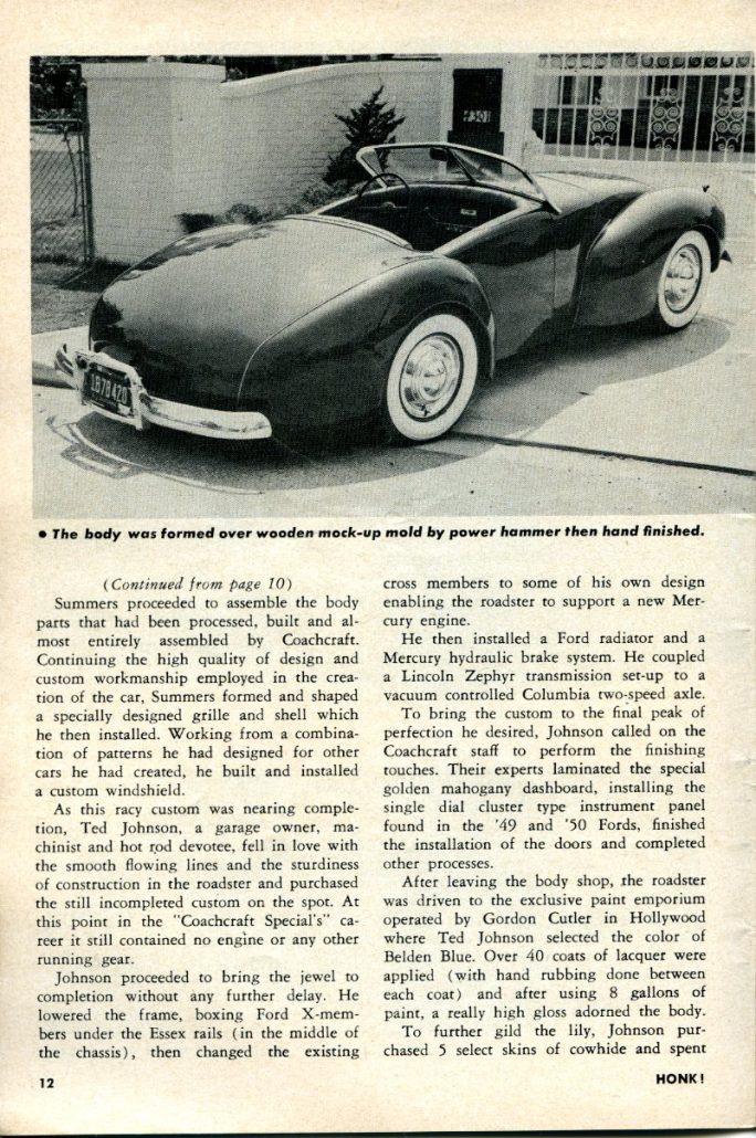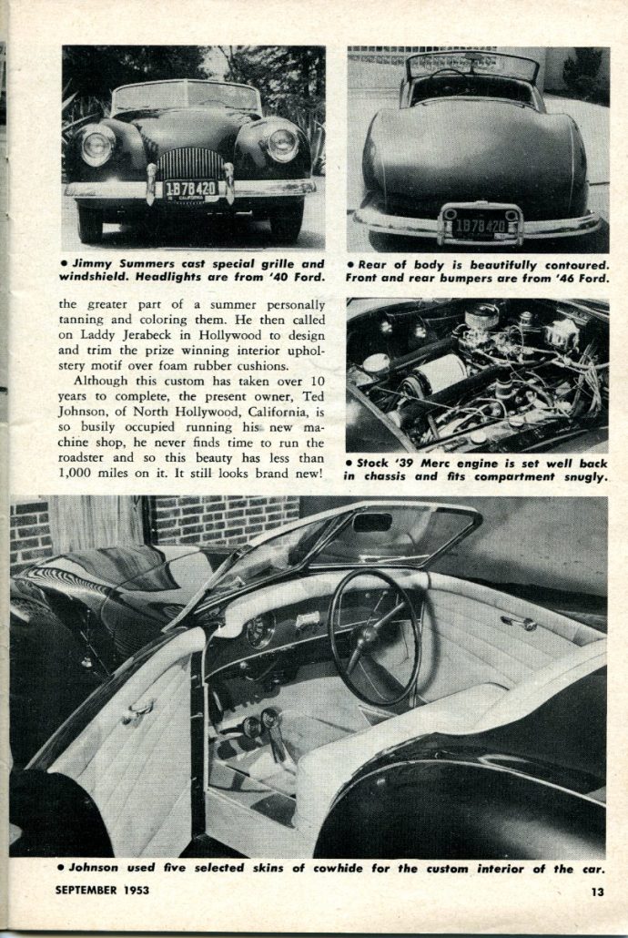 Ted began to finish much of the work, and called on Coachcraft again to perform the finishing touches. Final paint and upholstery were finished in Hollywood, and when completed in 1952, it was shown at the Petersen Motorama and was a prizewinner in every way.