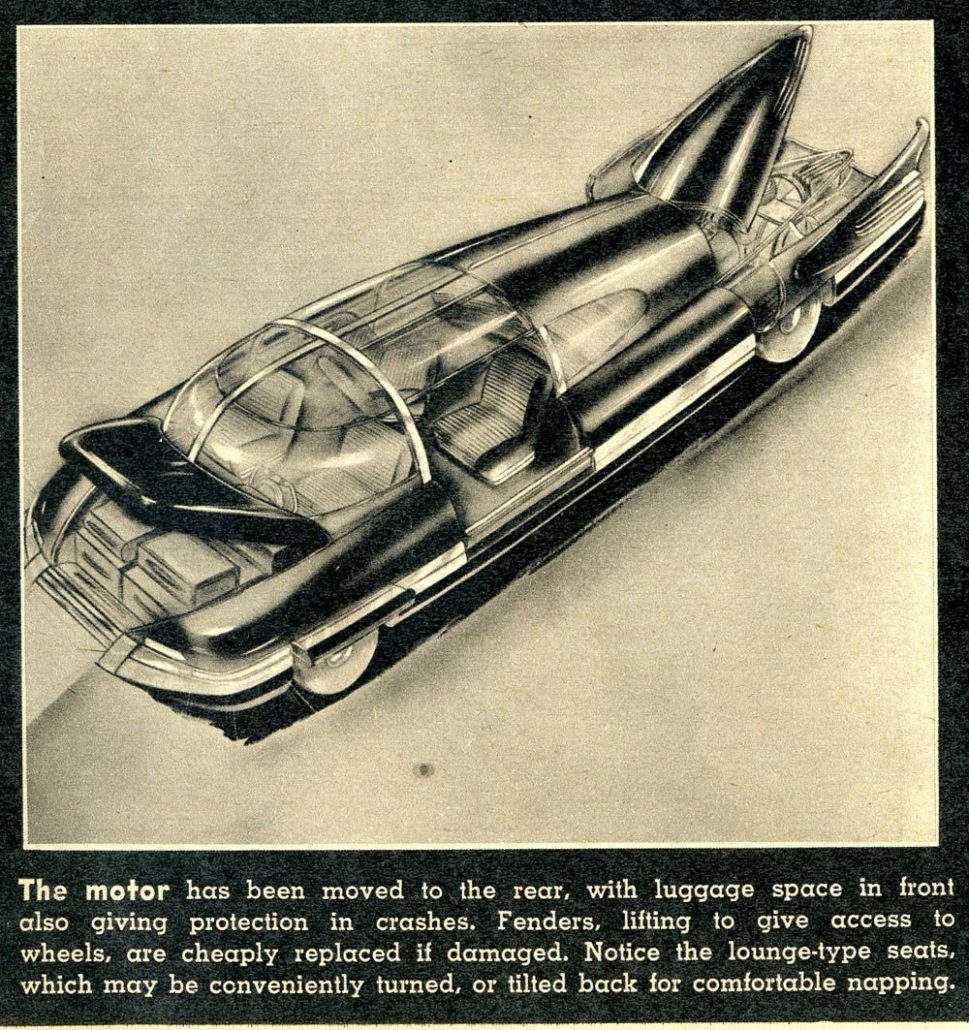 ENGINES: Located in the rear, with luggage space in front. Lighter engines, possibly air-cooled, with superb performance. With higher compression, they will use new high-octane fuels, perhaps a mixture of two-thirds gasoline, one-third alcohol. Influenced by Diesel experience, they may even burn solid gasoline injected without use of a carburetor and ignited by compression. Greater mileage – at least 30 miles per gallon for light cars.