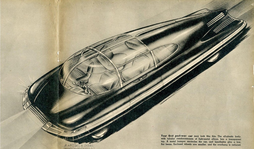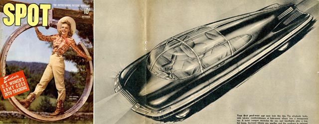 Let’s see what Spot Magazine had to say about what was coming down the pike in terms of futuristic automobiles – in plastic – to a postwar American public.