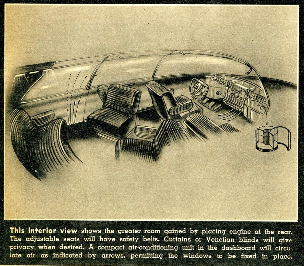Air-conditioning units will keep you comfortable, Summer or Winter; Polaroid body tops will permit passage of ultra-violet rays so that you can get a healthful, open-car tan; except for the driver’s seat the seats will be adjustable, easily tilted back for napping or turned to permit conversation, as well as capable of being moved out of the way to give room enough for sleeping in the rear of the car.