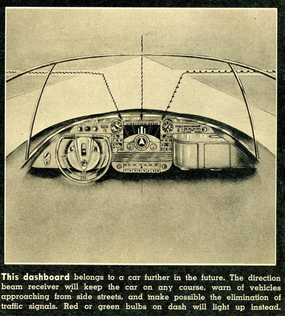 EQUIPMENT: Instrument panels will be reduced in size, making room for air-conditioning apparatus. New generators giving far more juice will make possible built-in radio telephones enabling drivers to talk to anyone having a receiver, although these will probably wait for awhile. Traffic lights may be done away with in time, in favor of red and green lights on the dashboard, operated by radio signals which will also give warning of cars approaching from side streets.