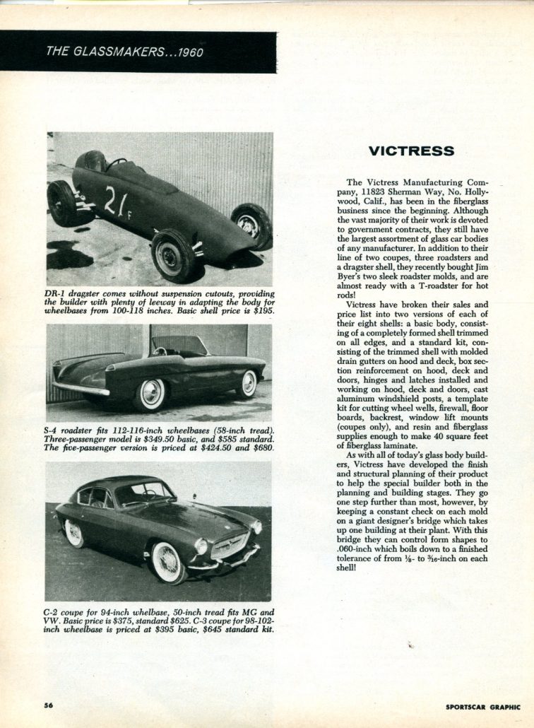 First, it’s great to see that Victress was being recognized as being the largest assortment of glass car bodies of any manufacturer as of the date of this magazine – 1960. And I’ve always maintained this was true. Think of all the body styles they had – and nearly every one was available in two sizes. When you contrast that with other body manufacturers of the early to mid ‘50s, Victress accomplishments were impressive!