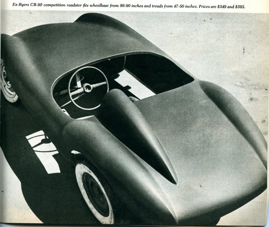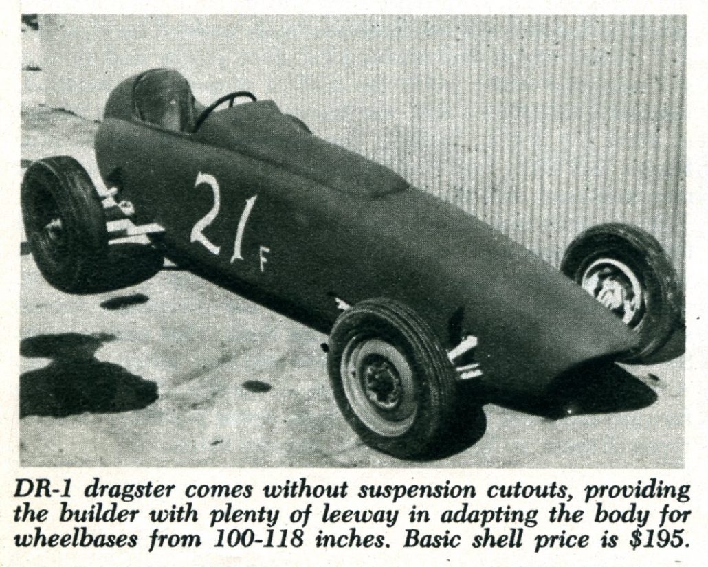 Although the vast majority of their work is devoted to government contracts, they still have the largest assortment of glass car bodies of any manufacturer. In addition to their line of two coupes, three roadsters and a dragster shell, they recently bought Jim Byer’s two sleek roadster molds, and are almost ready with a T-roadster for hot rods!