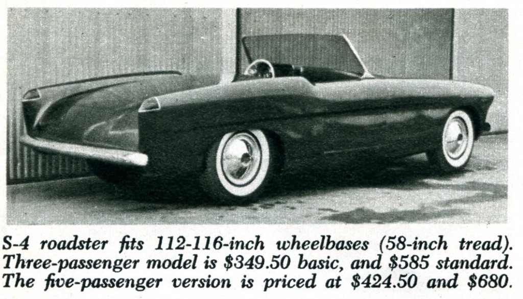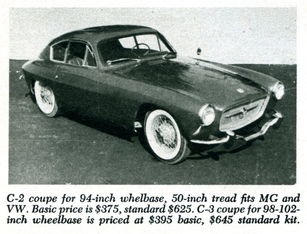 - And a standard kit, consisting of the trimmed shell with molded drain gutters on hood and deck, box section reinforcement on hood, deck and doors, hinges and latches installed and working on hood, deck and doors, cast aluminum windshield posts, a template kit for cutting wheel wells, firewall, floor kit for cutting wheel wells, firewall, floor boards, backrest, window lift mounts (coupes only), and resin and fiberglass supplies enough to make 40 square feet of fiberglass laminate.