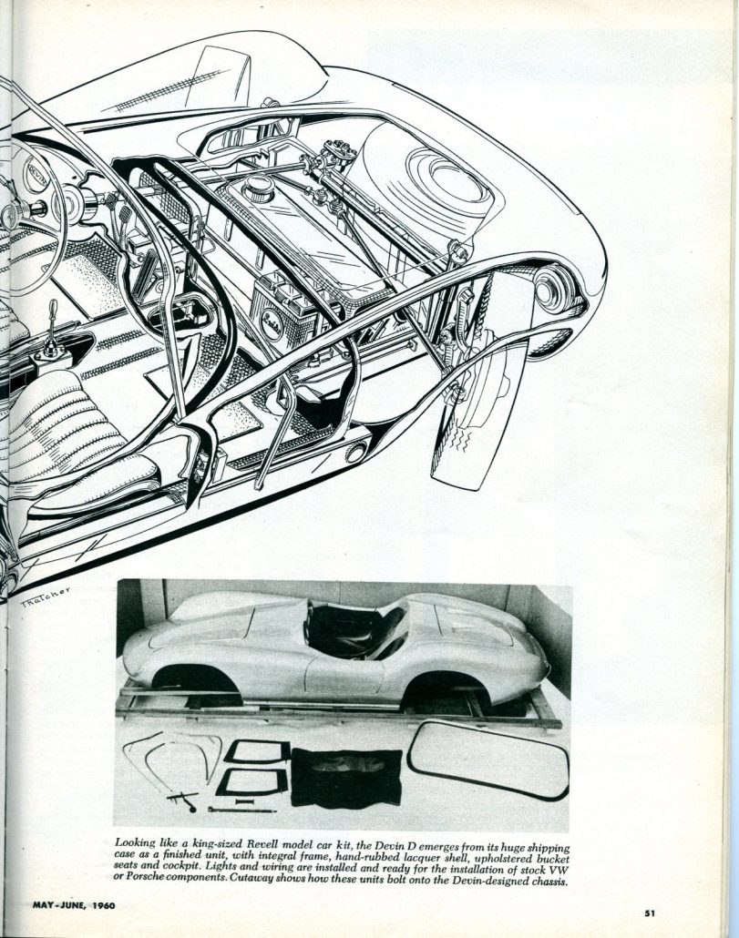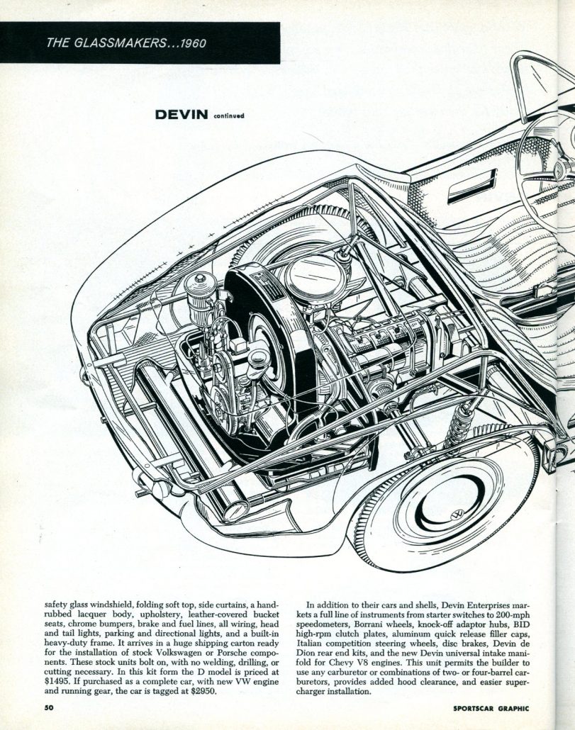 Wait! We do! This 12 page tome appeared in Sportscar Graphic in June 1960 and included two pages or more on each of the following cars: Devin, Kellison, LaDawri, Victress, and Almquist. And those were the “Big Fiber Guns” of fiberglass then, and it’s a very respectful review of each of these companies and what they had to offer.