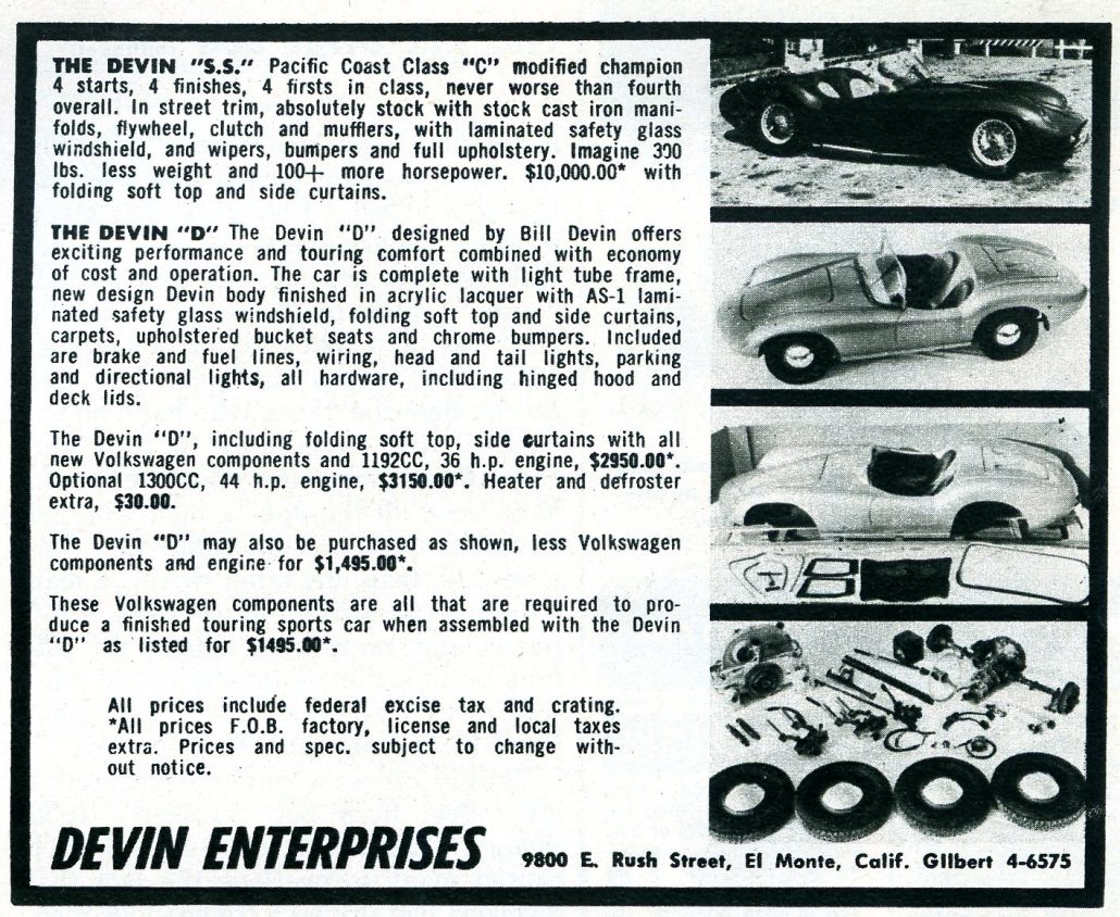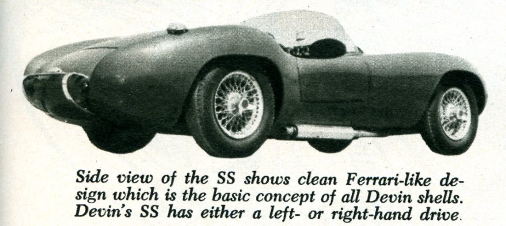 Bill Devin had started with his newest body shell in 1956, the one shown here in this story, and 4 years later he was up and running and growing strong with 27 different sized bodies offered for sale. His Devin SS sports car was available too – a powerful sports car by any measure.