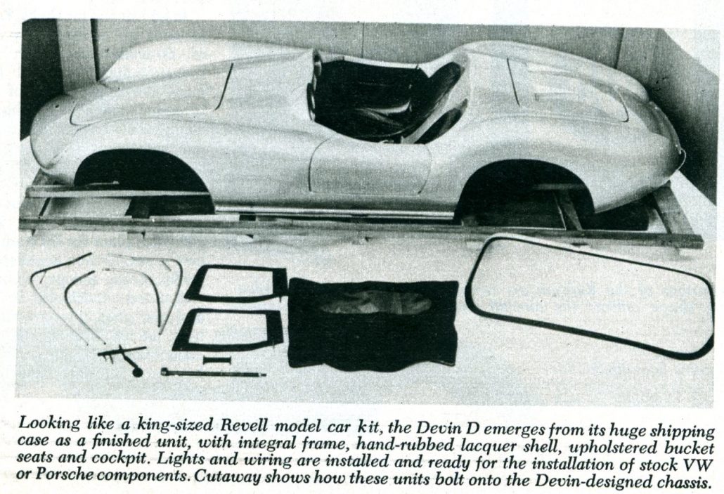 It arrives in a huge shipping carton ready for the installation of stock Volkswagen or Porsche components. These stock units bolt on, with no welding, drilling, or cutting necessary. In this kit form the D model is priced at $1495. If purchased as a complete car, with new VW engine and running gear, the car is tagged at $2950.