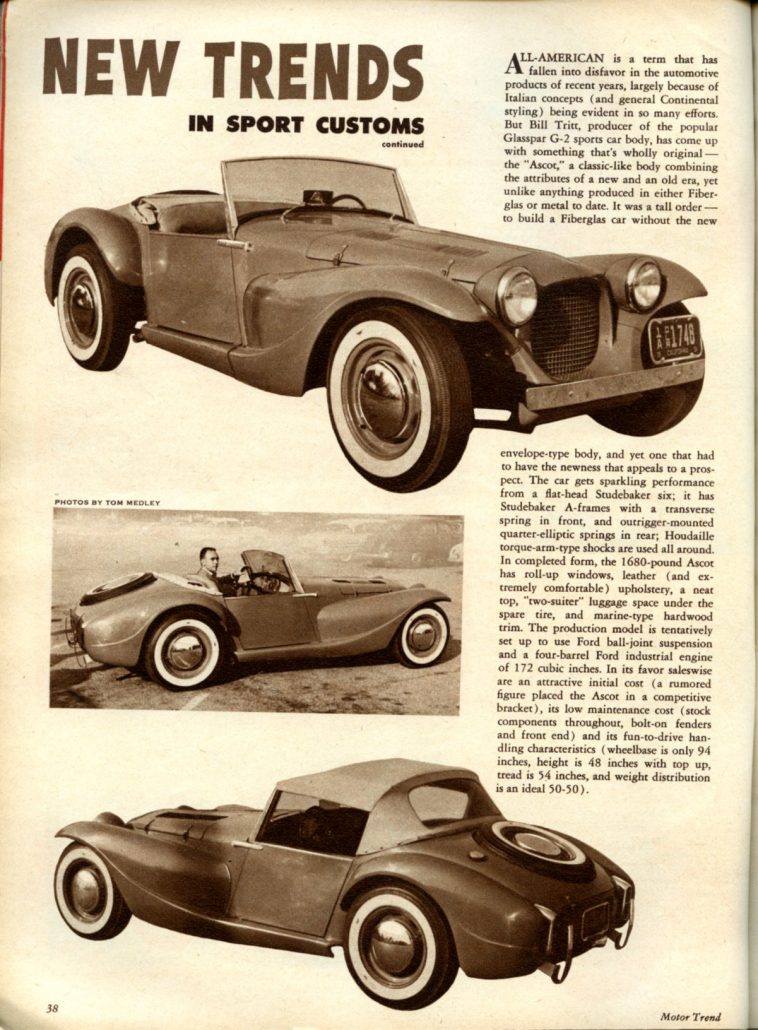 “All-American is a term that has fallen into disfavor in the automotive products of recent years, largely because of Italian concepts (and general Continental styling) being evident in so many efforts. But Bill Tritt, producer of the popular Glasspar G2 sports car body, has come up with something that’s wholly original – the “Ascot,” a classic-like body combining the attributes of a new and an old era, yet unlike anything produced in either fiberglass or metal to date.
