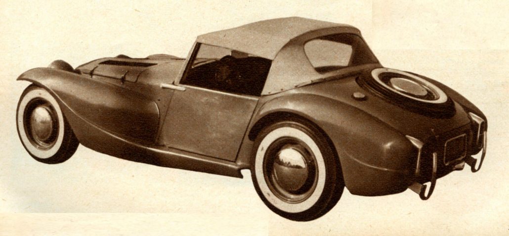 It was a tall order – to build a fiberglass car without the new envelope-type body, and yet one that had to have the newness that appeals to a prospect. The car gets sparkling performance from a flathead Studebaker six; it has Studebaker A-frames with a transverse spring in front, and outrigger-mounted quarter-elliptic springs in rear; Houdaille torque-arm-type shocks are used all around.