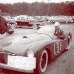 The car raced on Saturday for awhile. The carb caught fire so (it) did not finish. The mechanics removed the hood so they could work on the engine and Don Frost and Frank Hecox could clean the burnt hood. We worked on it most of the night to get it ready to race on Sunday – when this picture was taken.